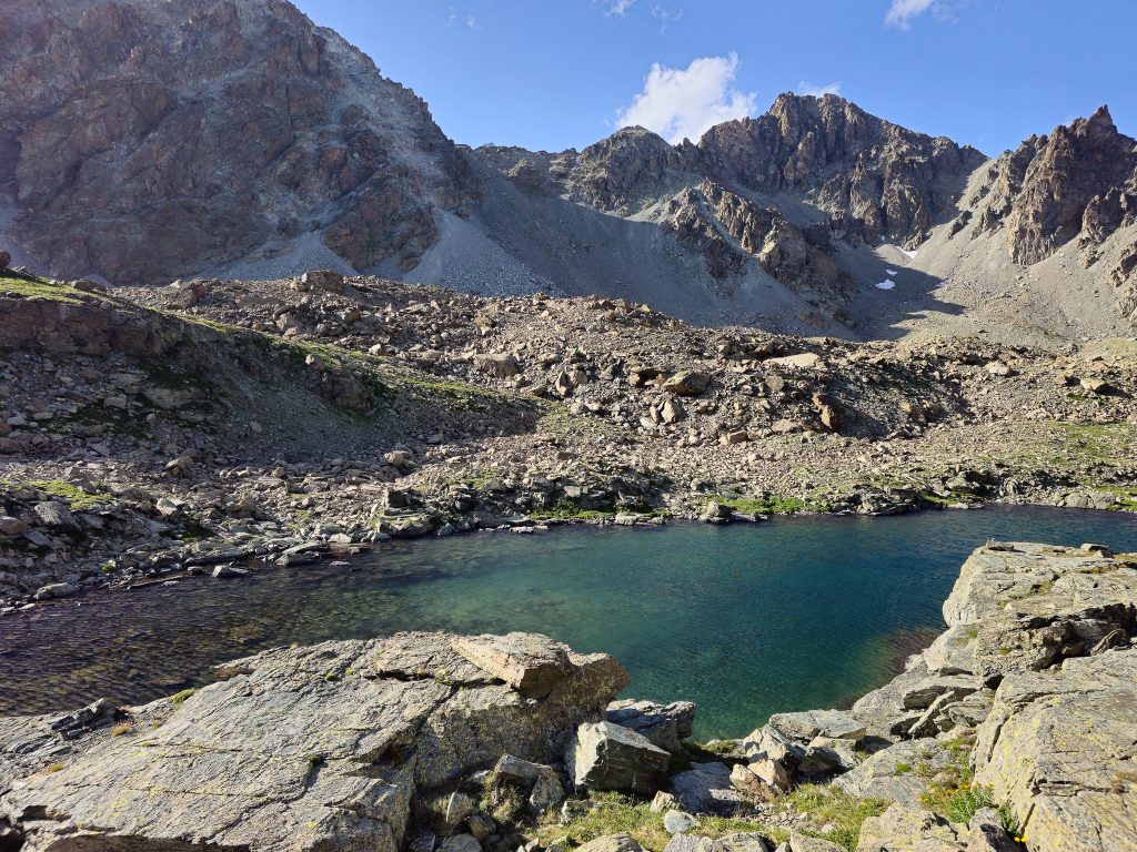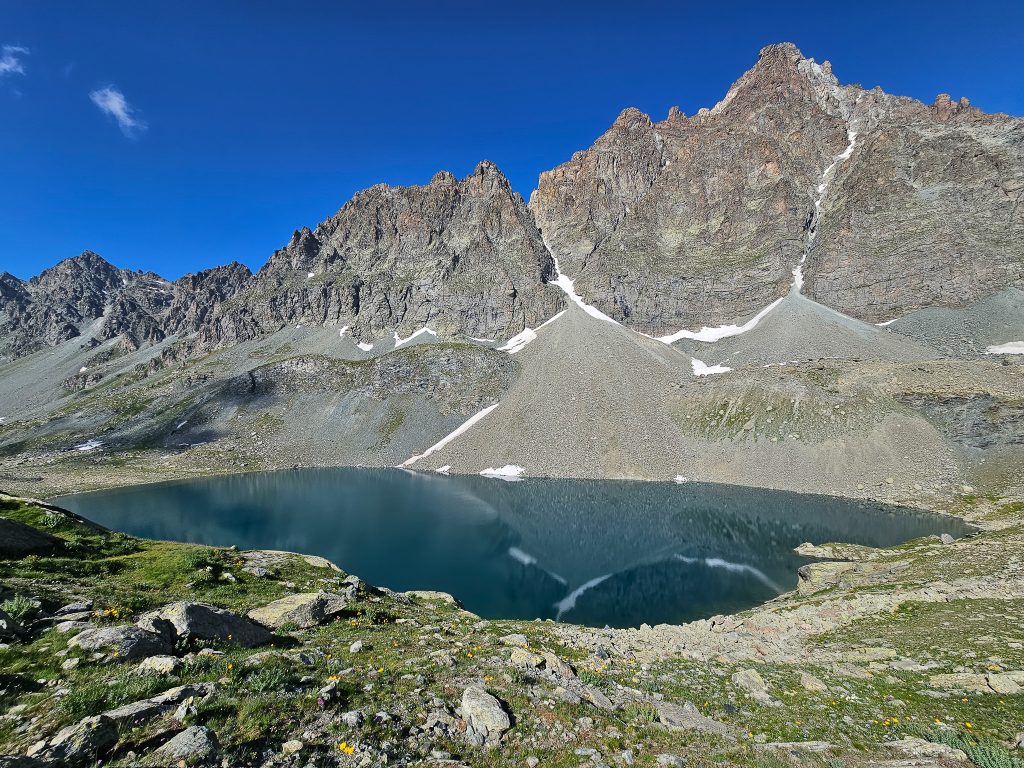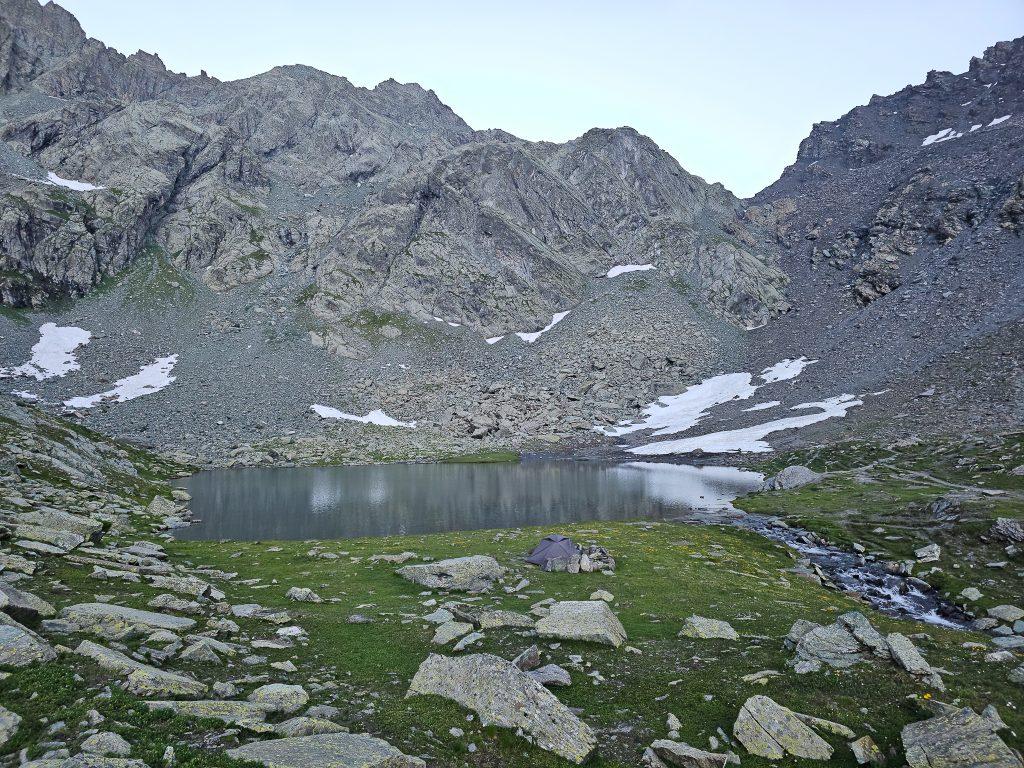 Arrivés au lac quel spectacle ! Nous sommes seuls, tout autour se dressent des pics imposants ! Ça valait la peine de marcher jusque là ! C’est ça le tour du Mont Viso…