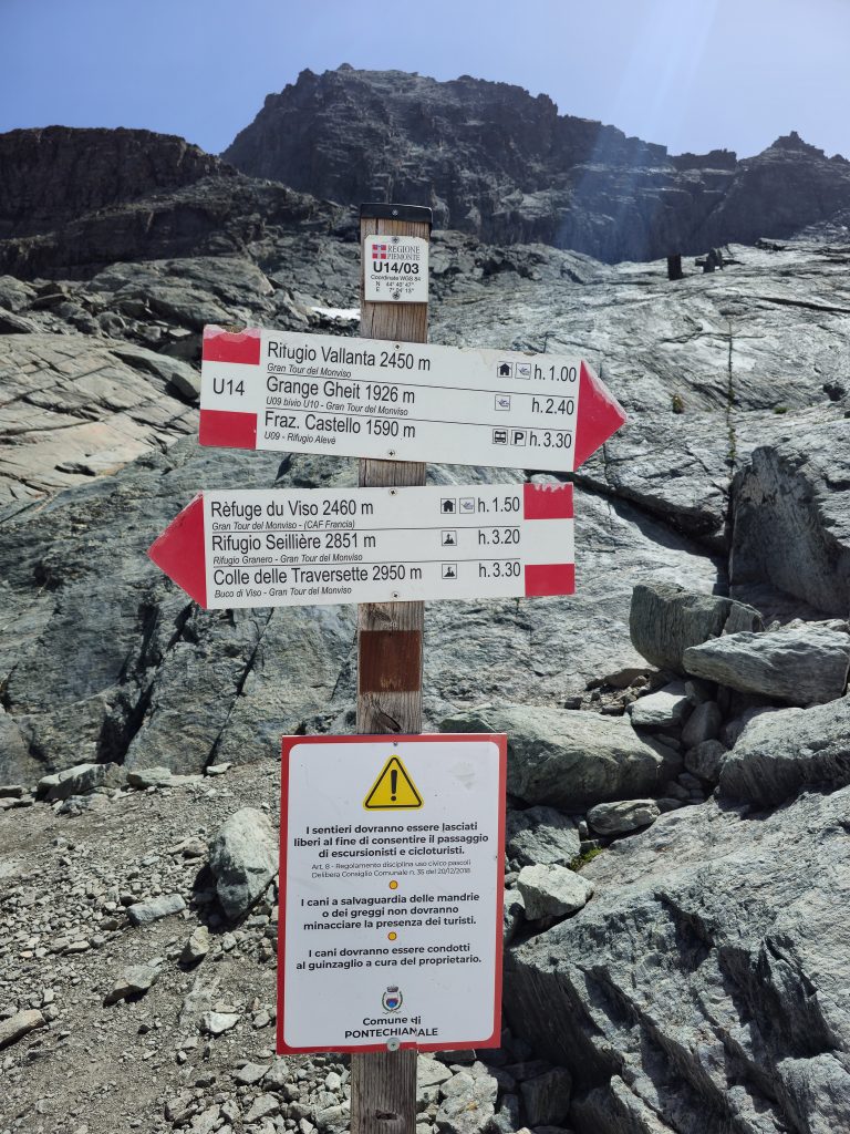 Le repas avalé, nous repartons nous poser un peu plus bas avant d’attaquer la grimpette qui nous attend pour l’après midi. Quelques minutes de repos et quelques bonbons avalés plus tard nous nous dirigeons vers l’intersection que nous devons prendre pour monter en direction du refuge de Quintino Sella. Ici les panneaux ne sont pas très clairs. L’un indique 3h30 l’autre 4h30 pour la même direction. Après quelques hésitations nous décidons de suivre notre GPS et de démarrer la montée qu’indique ces deux panneaux.