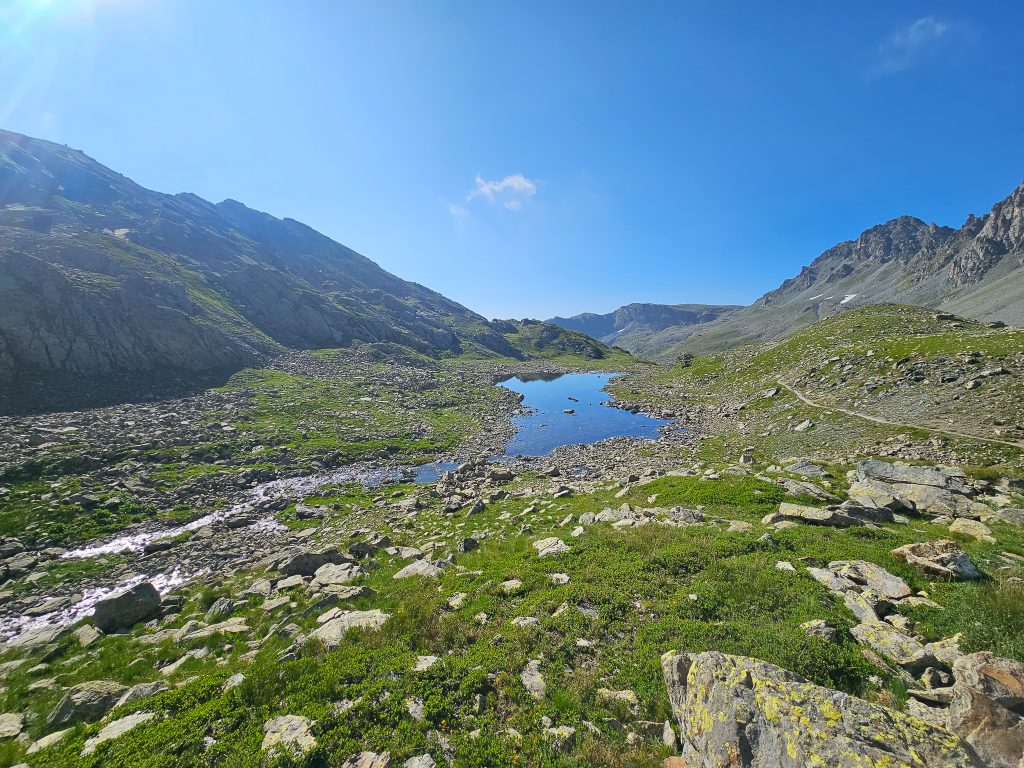 Presque tout le long de la montée nous avons une vue superbe sur le lac de Lestio en contrebas et nous pouvons à chaque coup d’œil apprécier sa couleur magnifique ! On reprend le tour du Mont Viso en beauté.