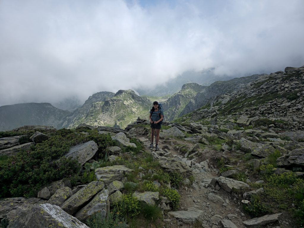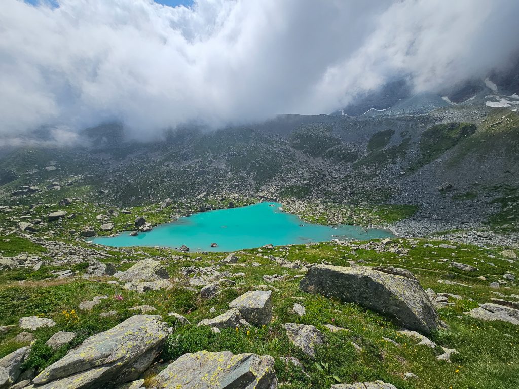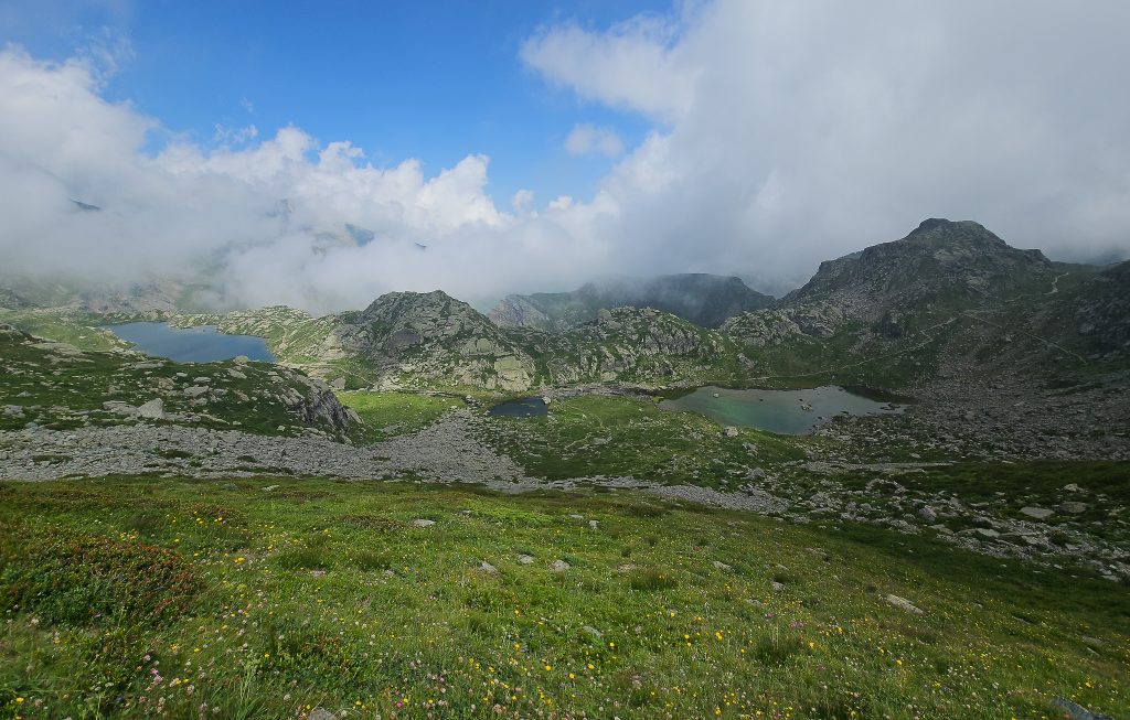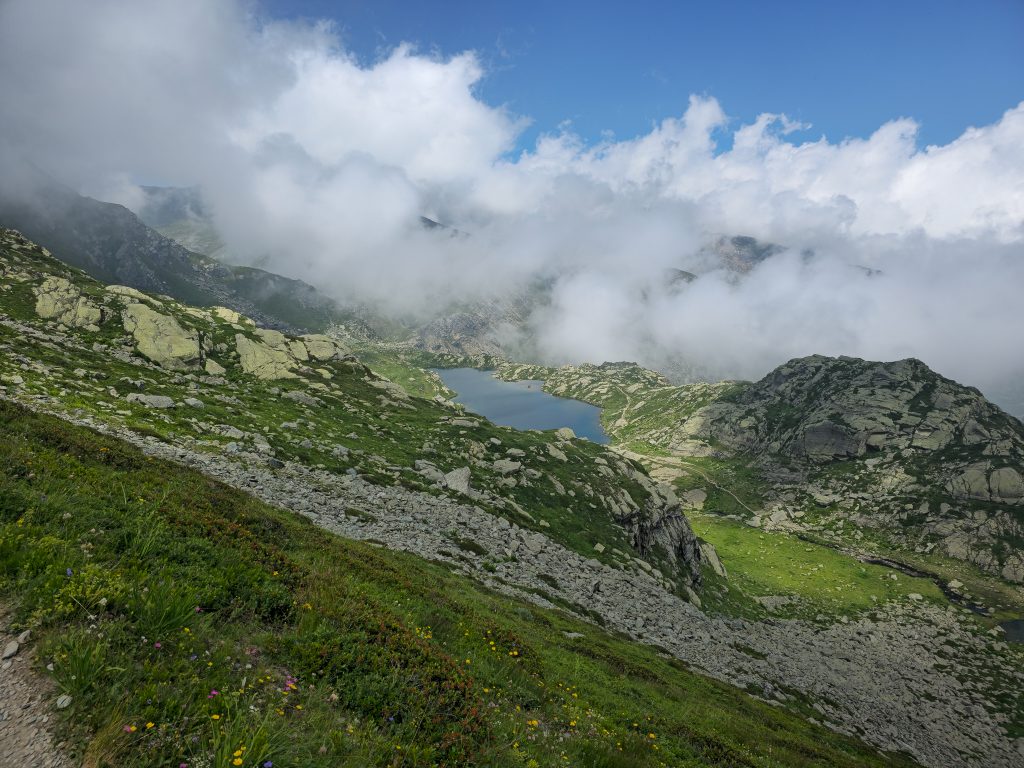 La vue sur les lacs est magnifique, plus on monte et plus le brouillard se rapproche. A partir de ce moment là le doute s’installe vraiment sur le fait de terminer le tour ce jour là… Je commence à peiner un peu à monter accompagné de mon gros sac à dos. C’est dur mais l’envie d’arriver au refuge de Giacoletti nous donne l’envie d’avancer !