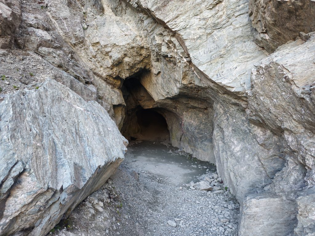 Après plusieurs courbes, nous finissons par apercevoir un bâtiment désaffecté proche du sommet. Est-ce la que nous pourrons prendre le fameux tunnel pour traverser le col et passer la frontière ? Nous le saurons en arrivant au dit bâtiment puisque depuis celui-ci nous arrivons à distinguer ce qui ressemble à un petit porche qui avance collé à la paroi, proche du sommet. Nous dépensons nos dernières forces pour l’atteindre et nous avons la surprise de voir de nouveau des petits bouquetins juste devant le tunnel !