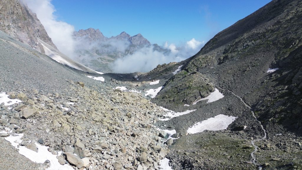 La descente n’en fini pas malgré que nous en voyons la fin depuis un bon moment. En descendant à ce point nous nous demandons combien de dénivelé positif nous allons devoir remonter pour passer le col de la Traversette. en effet il se dresse devant nous à un peu plus de 2900 mètres.